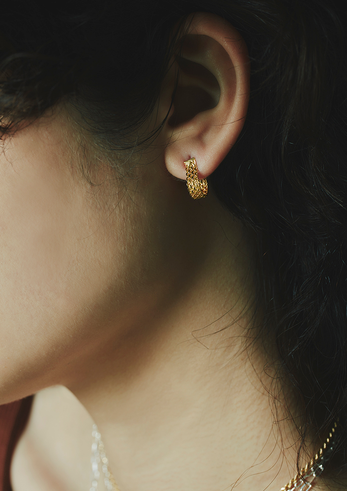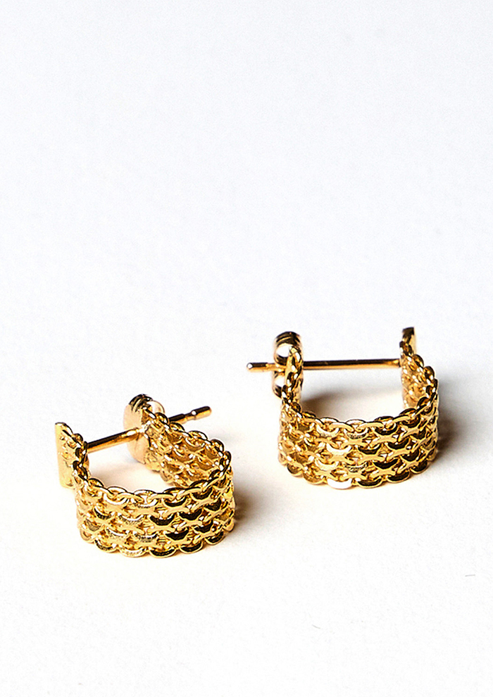 「ジャイプールの職人がチェーンを編み立てた独特な印象のフープピアス。幅広のチェーンはしなやかに曲線をつくり、耳元に繊細な輝きを添えます」。