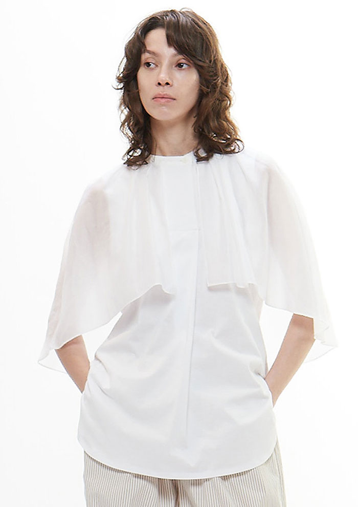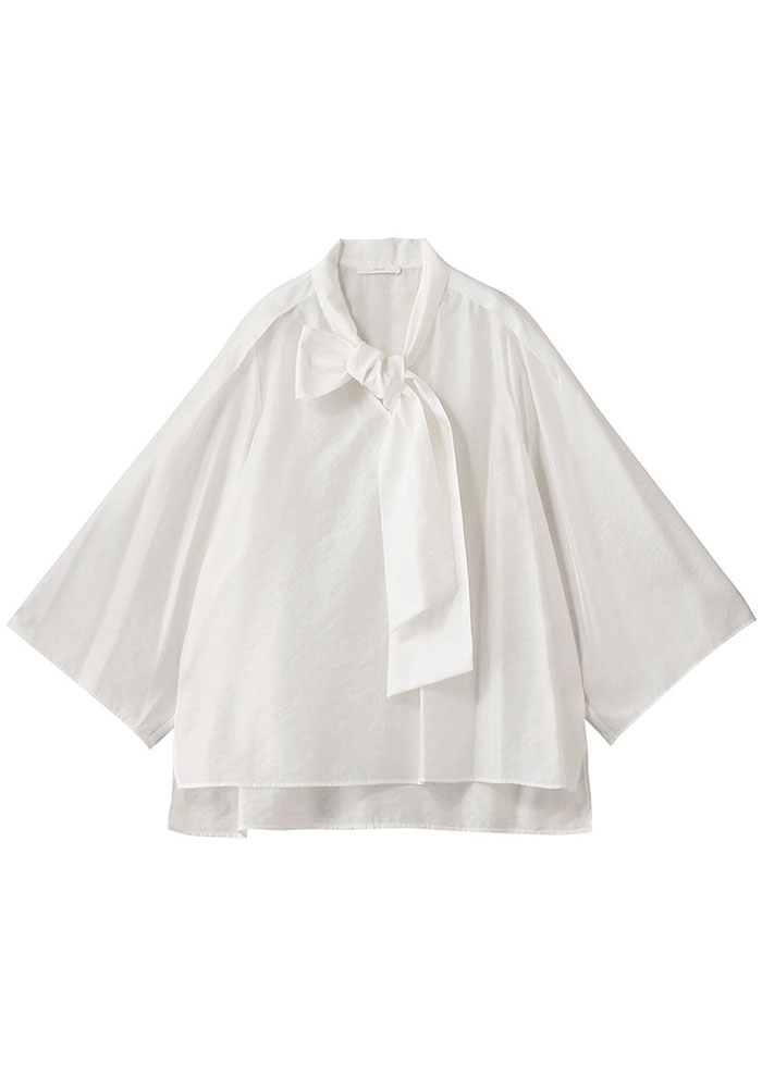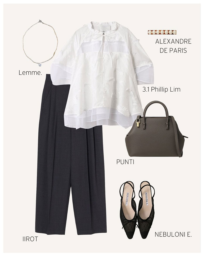 9月はまだまだ暑い日が続くから、きれいめの半袖ブラウスをPICK。フレア、シアーなどデザイン入りのものを選ぶと、座ったときもしっかり華やか。