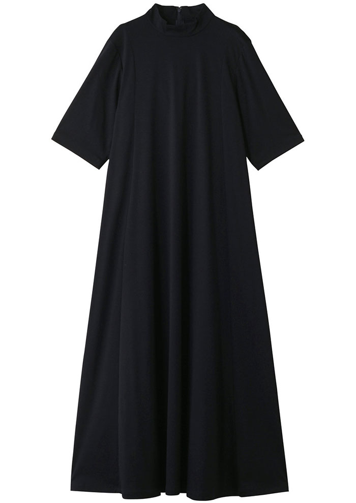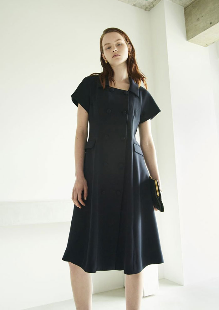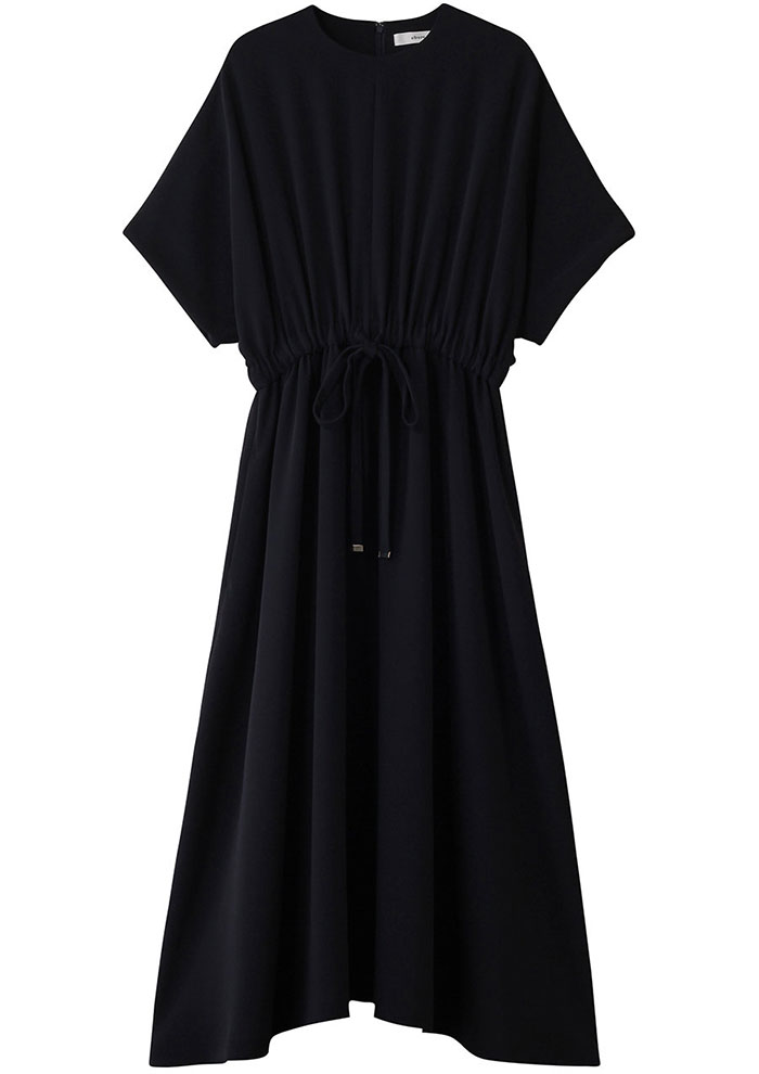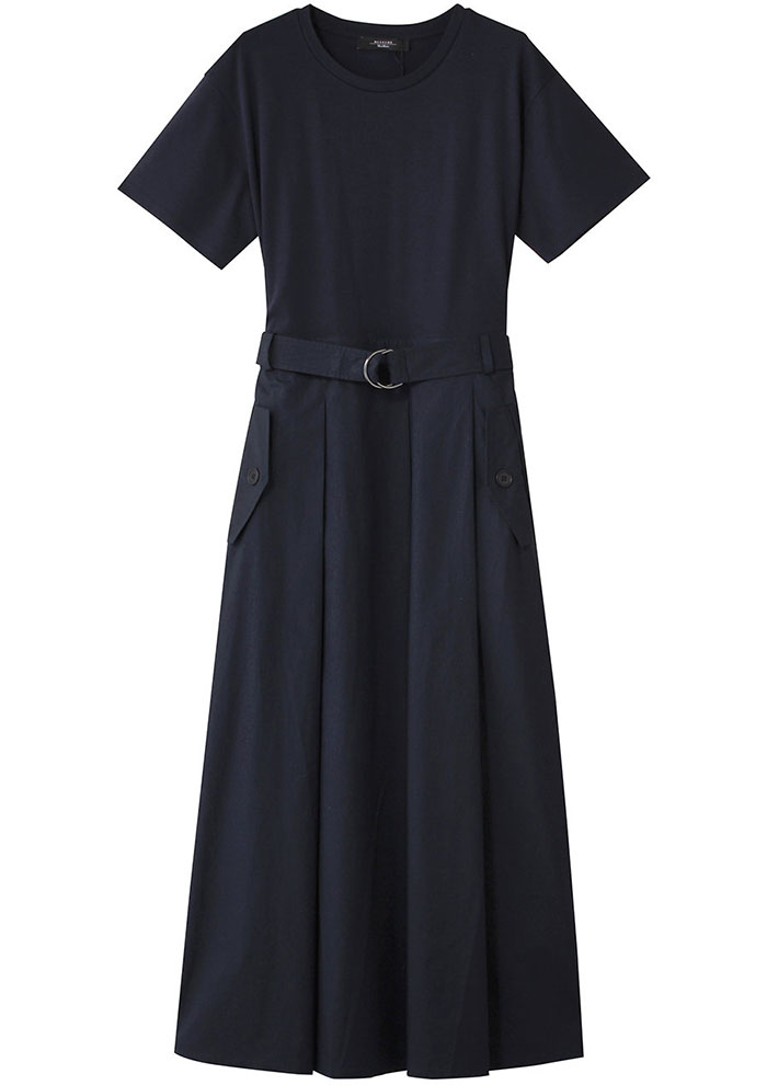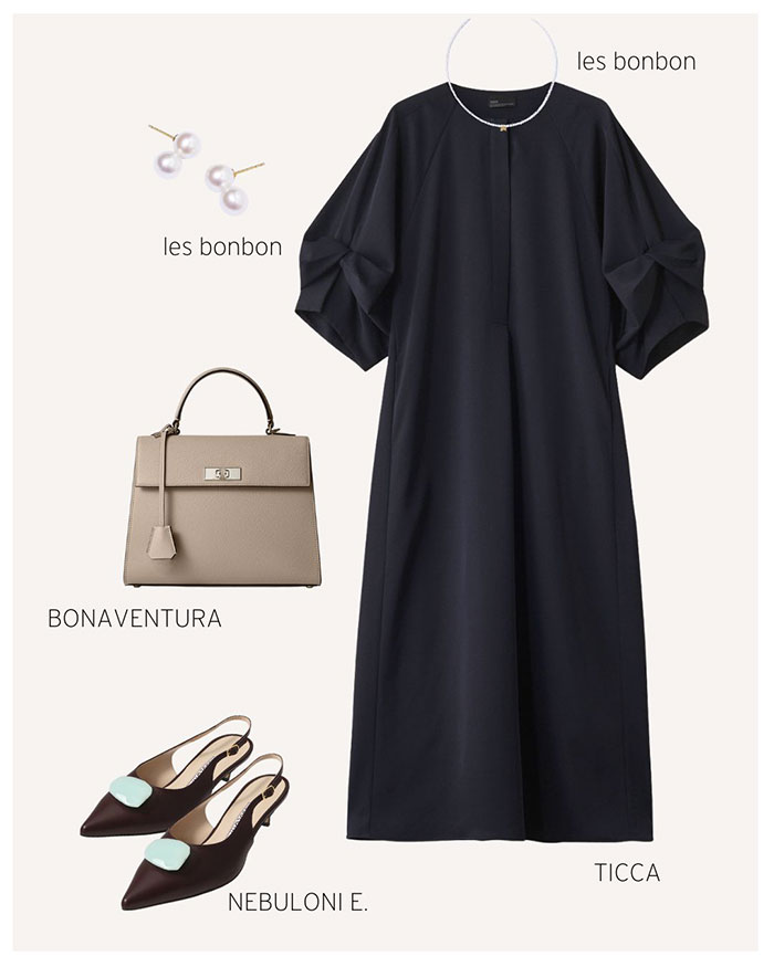 ブラックより柔らかく、でも凛とした雰囲気は保てる知的なネイビーをワンピースで。ベーシックなパンプスではちょっと物足りないときは、配色が美しいバックストラップパンプスでアクセントを。