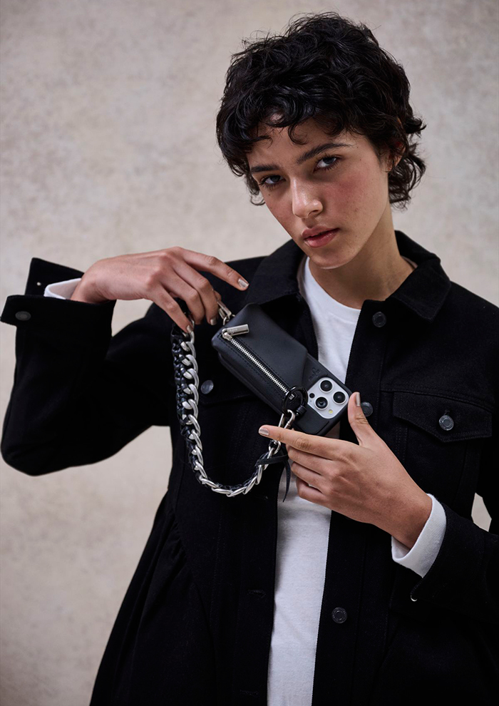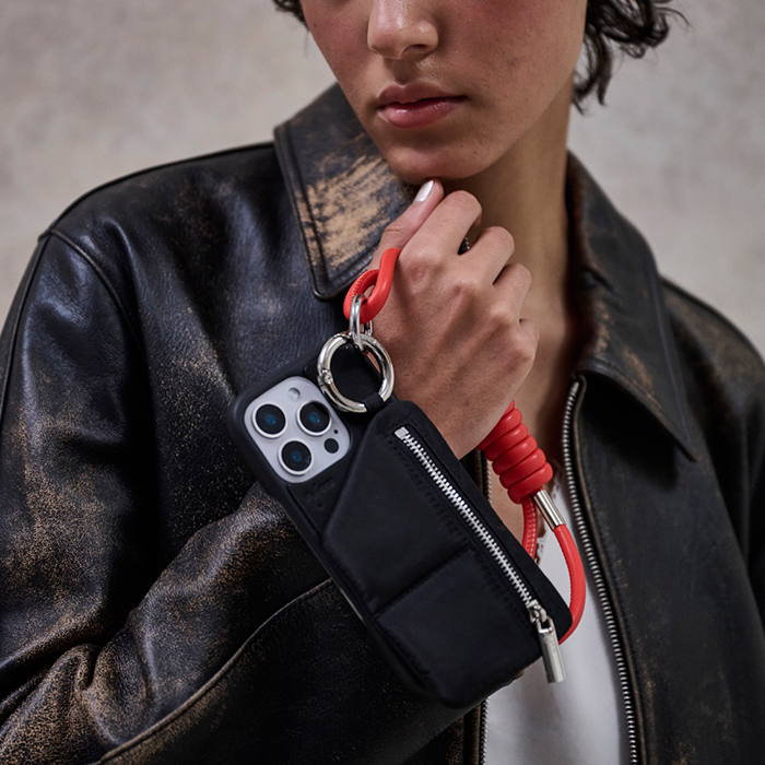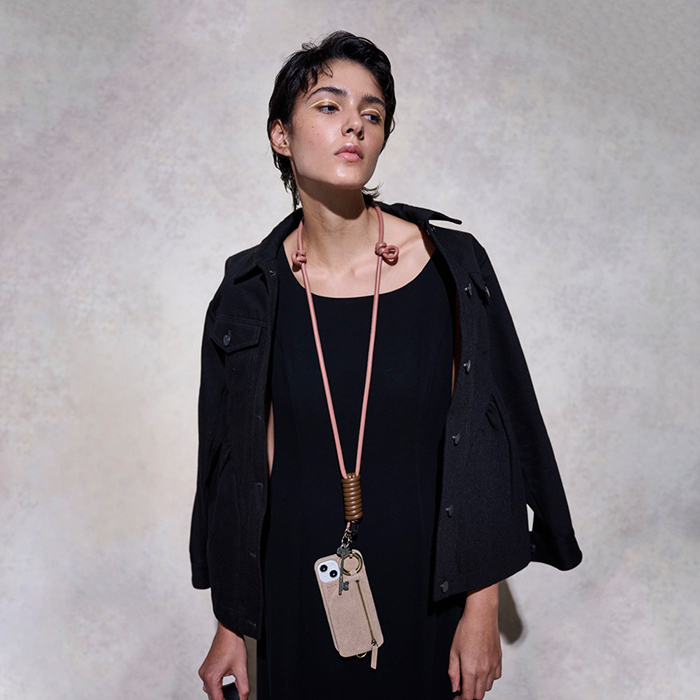 「日常に寄り添う携帯ケースをシンプルかつスタイリッシュなデザインで表現した「エジュー」の定番iPhoneケース。ケースフロント部分はジップ付きポケット仕様で、カードや鍵などを収納できます。ポケットのスナップを外すと、ケース自体が自立する機能も。限定色として、眺めるだけで心踊る大人なピーチピンクと、モノトーン好きにはたまらない洗練されたピュアブラックの秋冬らしいカラーが登場します。今季はアイコンのリングにもエッジを効かせたブラック仕様」。