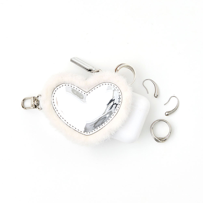 「ぷっくりとした立体的なハート型で、アクセサリーやイヤフォンがしっかり入るうれしいサイズ感。ポーチとしてはもちろんのこと、チャームとしても楽しめるアイテムです。同素材の“ajew cadenas puffer case shoulder”とリンク使いするのもおすすめ」。