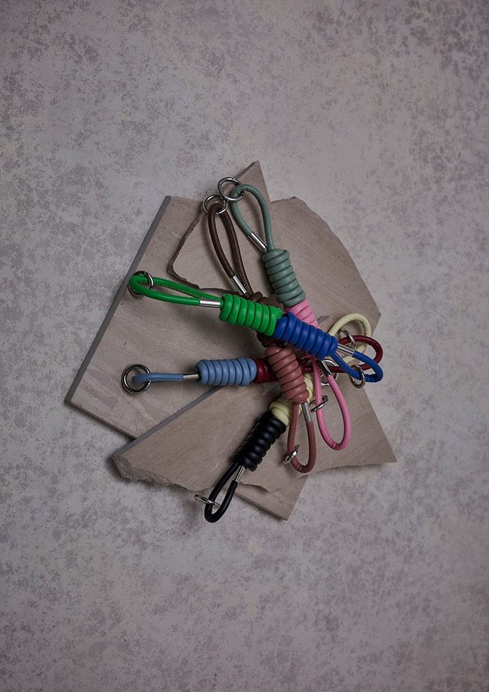 「ハンドストラップ、チャーム、キーホルダー、バッグのハンドルとして…取り付けるアイテムや場所によって役割や表情を変えてくれる、自由に楽しめるストラップ。色と色との組み合わせが楽しいコイルストラップは、5色展開です」。