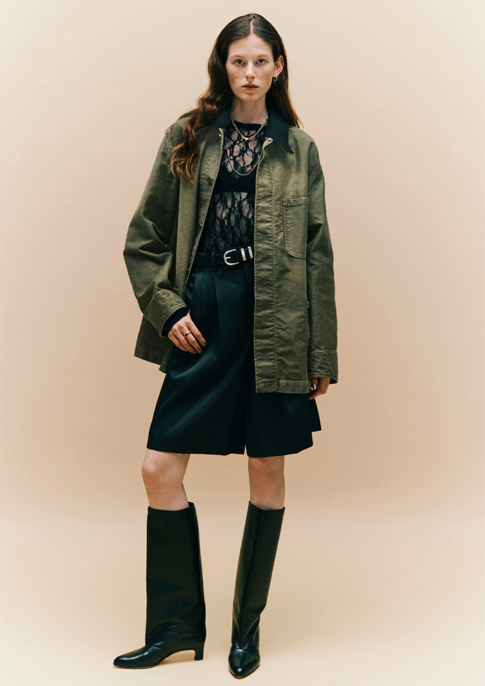 -ラフなカバーオールを繊細な黒でモードに昇華