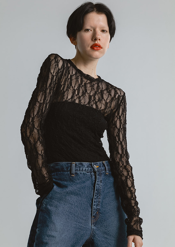 確実に今っぽさを演出できるカバーオールは、カジュアルに着崩すよりも、女性らしさが薫るアイテムとテイストミックスするのが正解。インには肌が透けるレースのトップスを合わせ、意外性のあるエッジィな装いに。