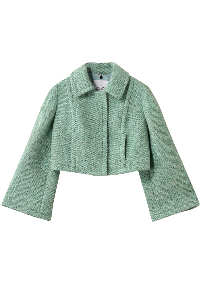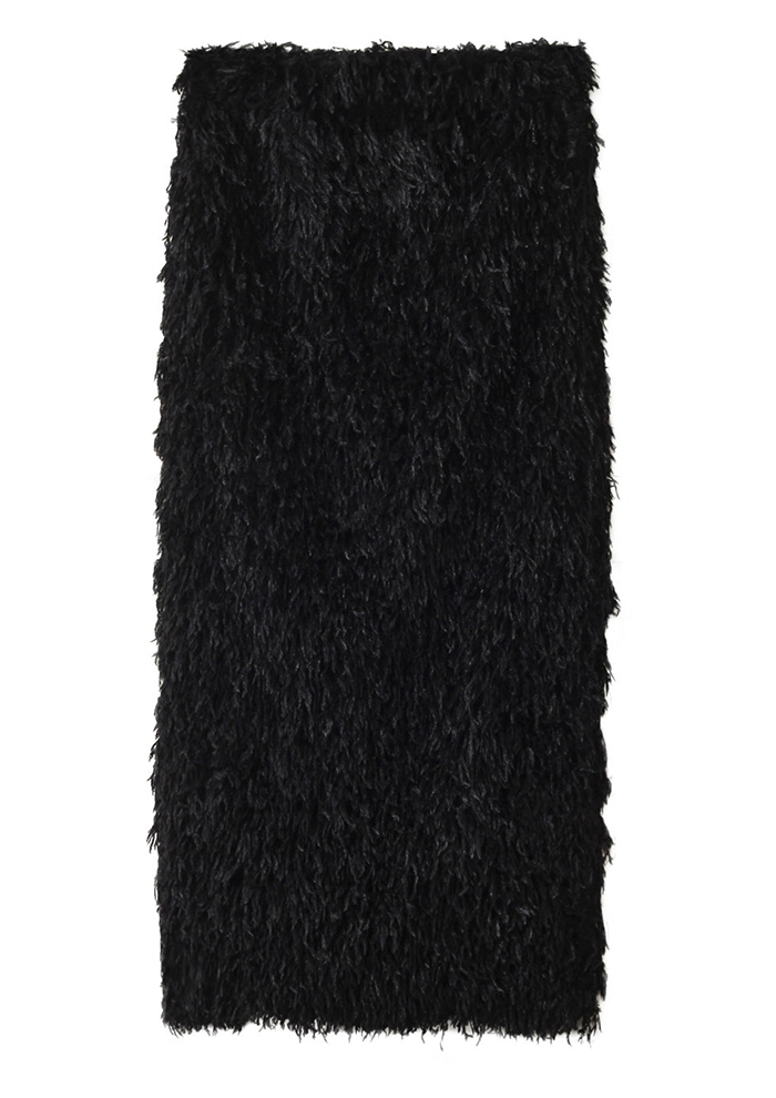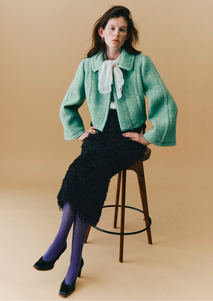 より女性らしさを意識した、レディライクなスタイルが新鮮な今シーズン。フェザーの素材感が目を引く膝下丈スカートに、ショート丈のジャケットを合わせて、ロング&リーンなラインを強調。タイツのパープルがスタイリングの引き締め役に。