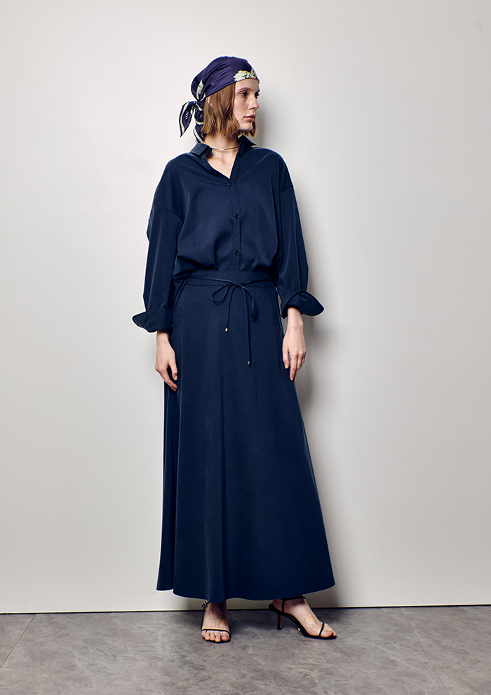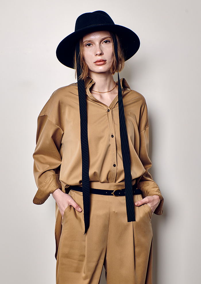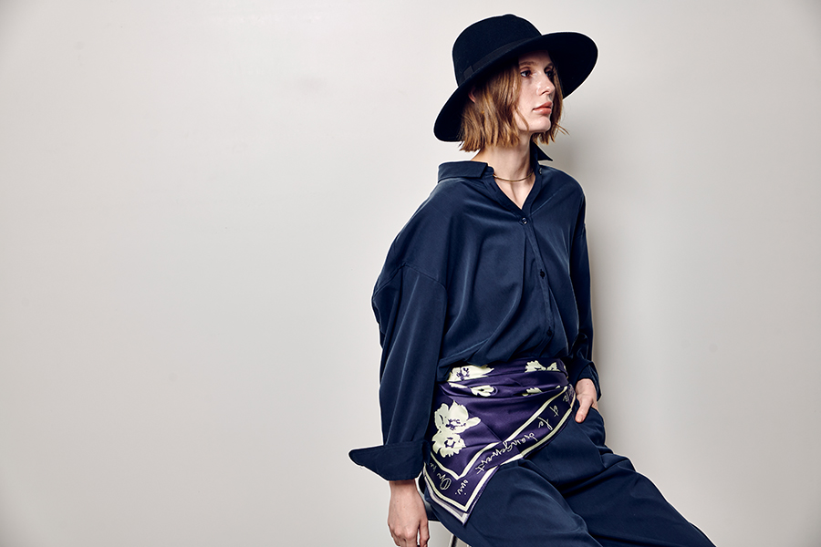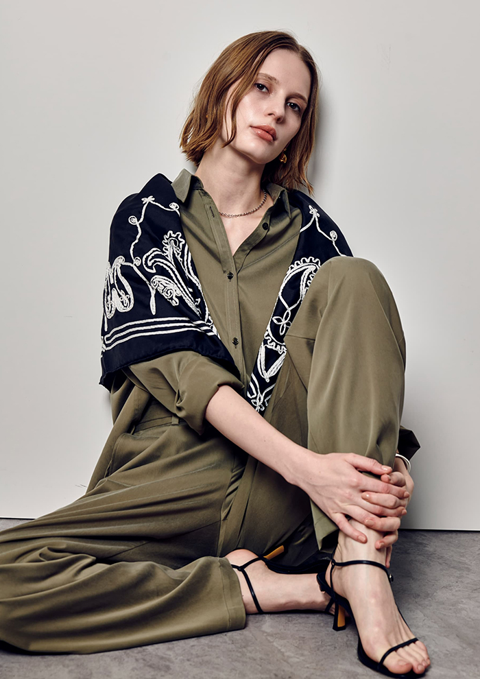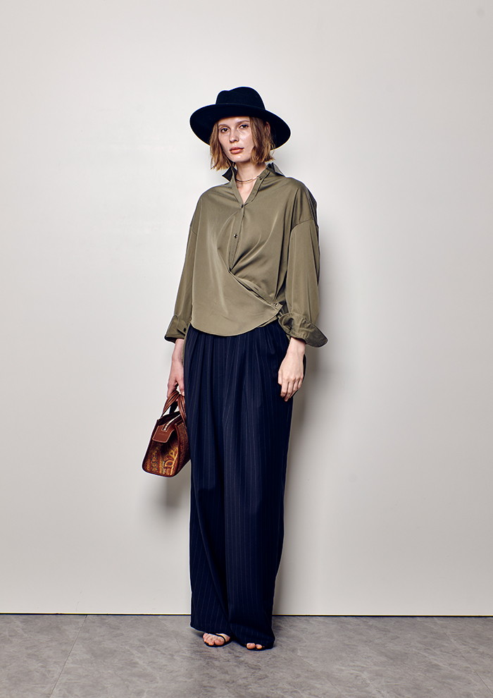 「まずは、秋のおしゃれを即実現するフィブリルキュプラシリーズから。それぞれ主役として使えるシャツ、パンツ、スカートがラインナップ。セットアップとしても楽しめます。ベージュ、カーキ、ネイビーのシックな3色展開」。