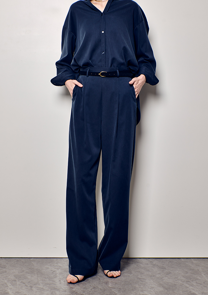 「ウエストのタックが立体感を生み、共地ベルトで引き締め感をプラス。美しいストレートラインに、リラックスしたはき心地も魅力」。