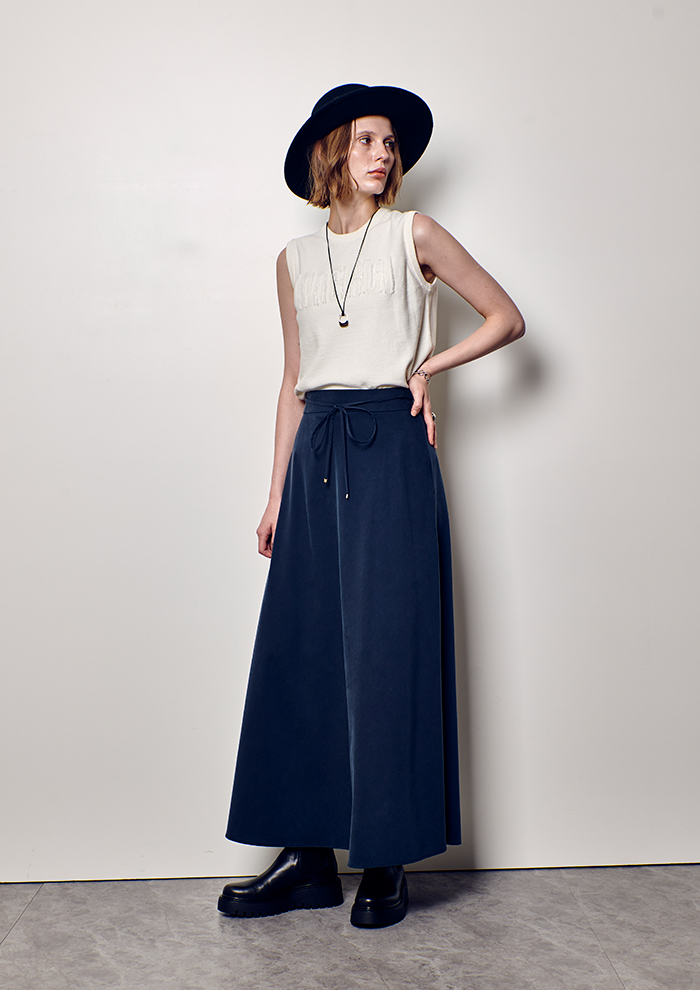 「ゆるやかに広がるフレアラインとキュプラのツヤ感で、女性らしさを演出。バックウエストゴム仕様のため、長時間の着用も快適です」。