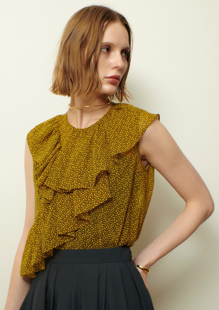 「深みのあるイエローで秋の雰囲気がまとえるブラウス。薄手のさらっとした素材感は季節の変わり目から活躍し、細かいプリントもオンからオフスタイルまでカバーします。デニムアイテムとのコーディネートがおすすめ」。