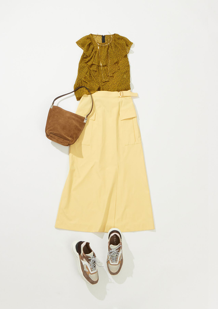 「今すぐ着るなら明るいイエロートーンでまとめたカラーコーデがお出かけの高揚感を引き立てます」。