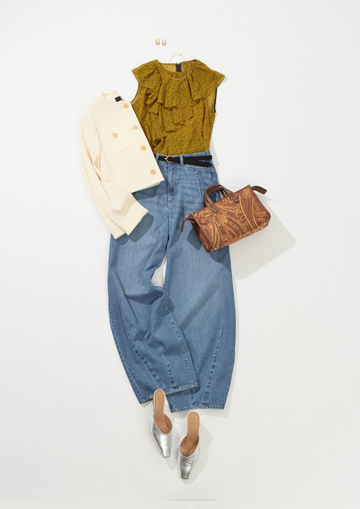 「カーディガン感覚のジャケットを羽織って華やかなオータムスタイルに」。