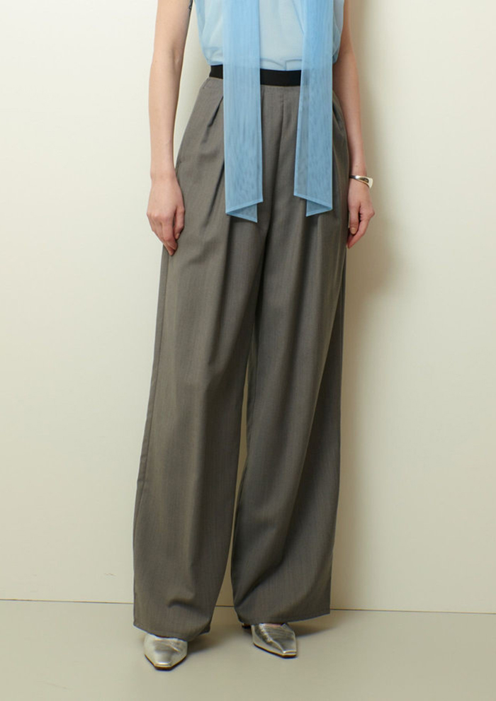 「ゆったりとしたワイドシルエットのパンツは、トップスと合わせるだけできまる優秀アイテム。新作のこちらはサマーウール素材とフロントのアシンメトリーなタックがモードな印象ながら、ウエストゴムがリラックスしたはき心地を実現」。