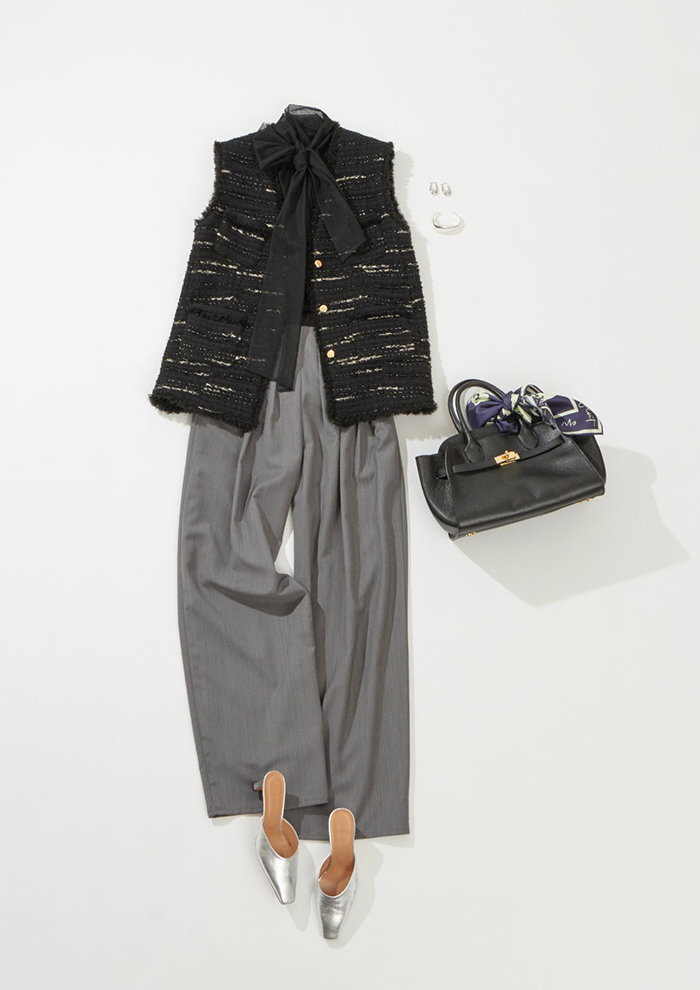 「残暑の残る時期はツイードジレやボウタイを合わせてオフィスコーデに」。