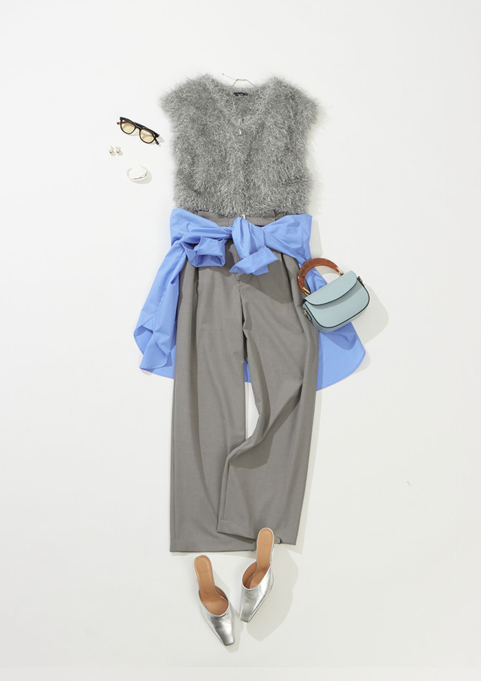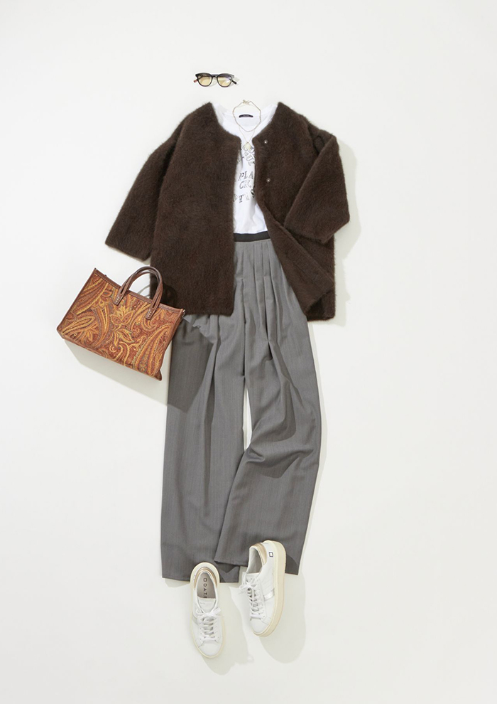 「コンパクトな丈感を生かしたワイドパンツとのワントーンコーデに、カラーアイテムをプラスして」。