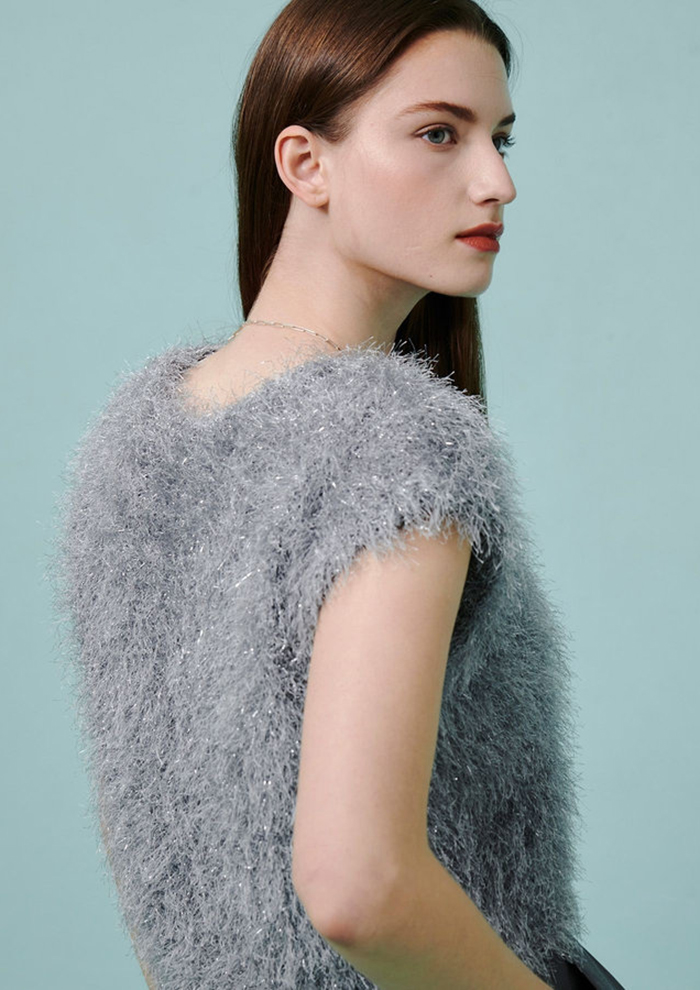 「夏から秋にかけて人気のシャギープルオーバー。今年は細かなラメが混じった素材を使用し、より華やかかつ涼しげにアップデートしています。秋が深まったら、ワンピースの上やブラウスなどとのレイヤードにも重宝するはず」。