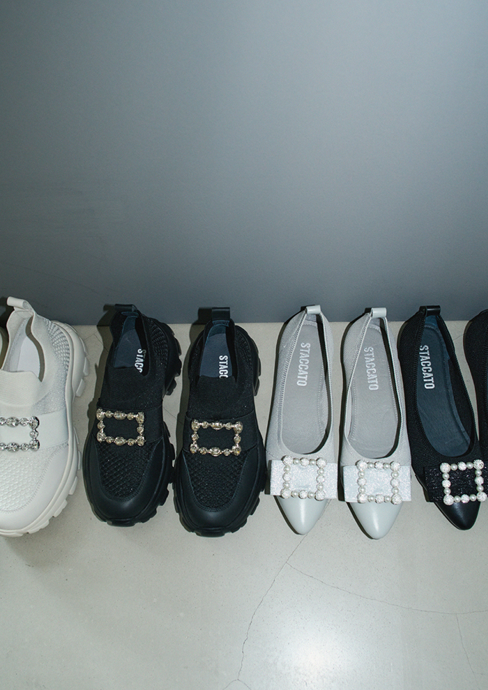 「エレガント×カジュアルな「スタッカート」らしいスニーカーは、スリッポンタイプでさらりと履けるのが魅力的。見た目に反してとても軽量で弾力のあるスニーカーソールのため、快適な履き心地です。そして、毎日でも履きたくなるのが、ファッショナブルなニットバレエシューズ。ラメ入りリボンにパール×ストーンのバックルを装飾したデザイン、柔らかな足あたりが◎」。