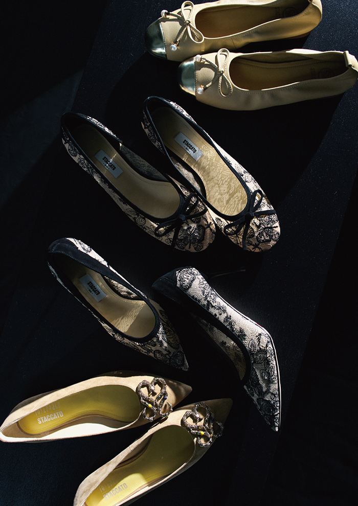 「足元で映える、華やかな4足にご注目を。ライラーライトバレエは、パール付きリボンと柔軟性に優れた履き心地が特徴。ヒールのないフラットデザインながらカジュアルになりすぎず、きらびやかな足元を演出してくれます。パリスパールフラットは、繊細なレースのベース地に立体感のある刺しゅうをほどこした、上品見えするカッターシューズ。パリスパンプスは、スタイリングを引きしめるブラックテープと、かかと部分のさりげないスターモチーフがポイントです。華奢な細ヒールと絶妙なカッティングもスタイルアップ効果を発揮! そして、カラーグレインバックルフラットは、ブローチのようなオリジナルバックルにビーズを散りばめた、個性が光るカッターパンプスです」。