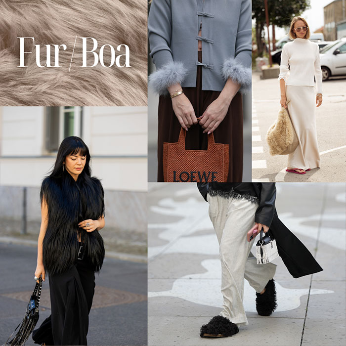 最後に紹介するのは、秋冬らしさを一気に加速させるファーやボアアイテム。羽織るだけでリッチなムードと季節感を醸し出せるので、ぜひ挑戦していただきたいアイテムです。コートやジャケットといった主役アイテムはもちろん、今からコーディネートしやすいファーバッグやボアのサンダルなど小物で取り入れるのがおすすめ。部分的に取り入れるだけでも十分に季節感を演出できます。普段のコーデをラグジュアリーに一気に格上げしてくれる最上級アイテムです。