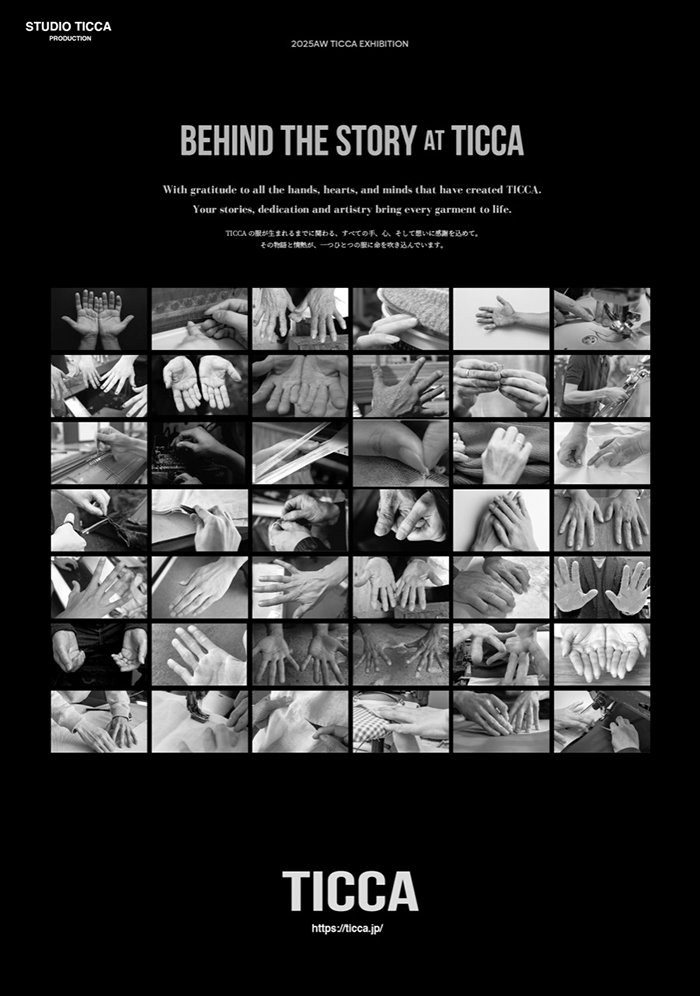 「2025年秋冬のテーマは、“BEHIND THE STORY AT TICCA”。ひとつの服をつくるにはたくさんの人の手を通って、長い時間と手間を要します。「ティッカ」が大切にしているのは、素材の良さや着心地、どんな体型の人にも似合う服であること。その背景にあるすべての物語への感謝の気持ちを込めて、新しい素材やカラー、デザインの上質な服をお届けします」。