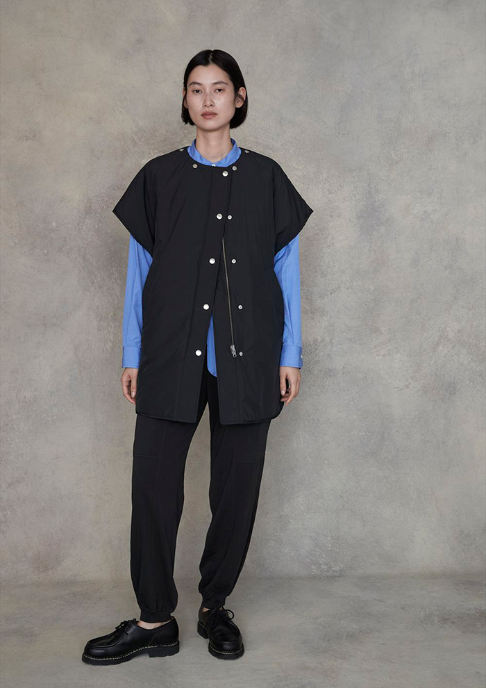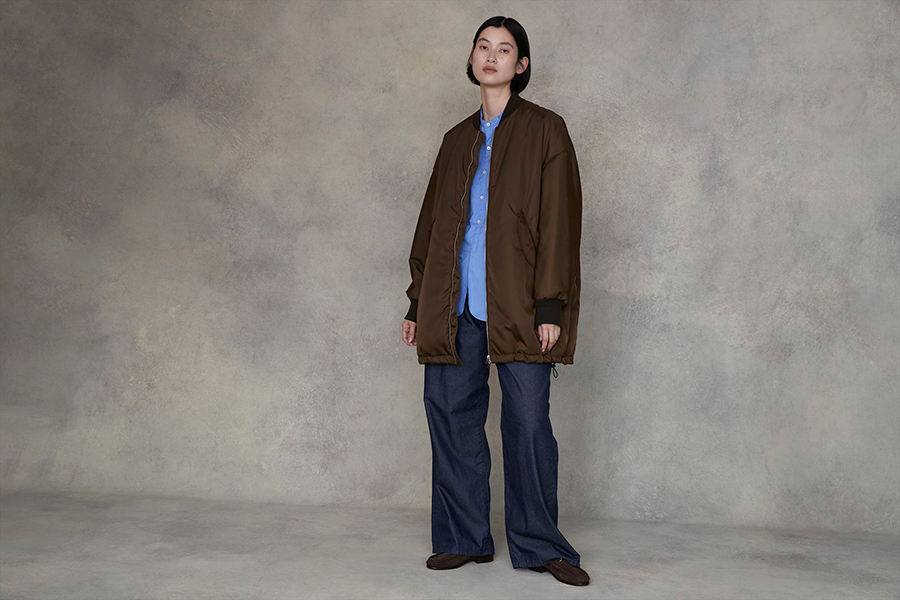 「やや長めのチュニック丈が特徴のMA-1は、どんなトップスとも好相性。裾のコードを絞ってコクーンシルエットにすれば、よりモードな印象に。細かなディテールが随所に光るリラックス感とノーカラーシャツを合わせたスタイリングは、大人のきれい目カジュアルを叶えてくれます」。