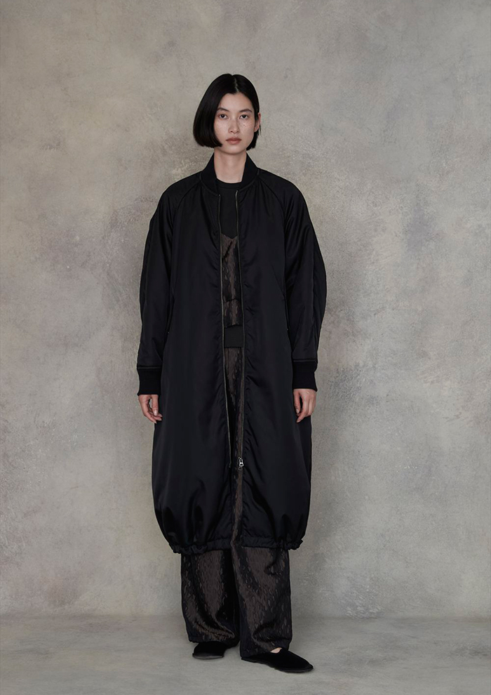 「こちらは、リサイクルナイロンを用いたロングMA-1を羽織ったストリートモードな着こなし。MA-1は身幅にほどよいゆとりを持たせ、さまざまなトップスとのレイヤードが楽しめる設計です。スキニーやレギンスでロング丈を際立たせるのはもちろん、ワイドパンツでボリュームを出せばモード感絶妙なスタイリングに」。