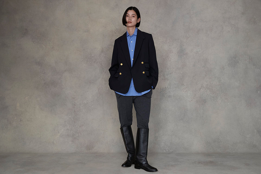 「オーセンティックな端正さと、品のある光沢やしなやかさが放つ女性らしさ。その二面性を兼ね備えたジャケットに、あえてきちんとしたシャツとニットパンツを合わせて、エッジの効いたバランスに仕上げました。ワンピースやチュニックとのスタイリングにも自在に取り入れられるニットパンツは、裾の長めリブがアクセント。ロングブーツとのコンビネーションでさらにモードな印象を引き立てます」。