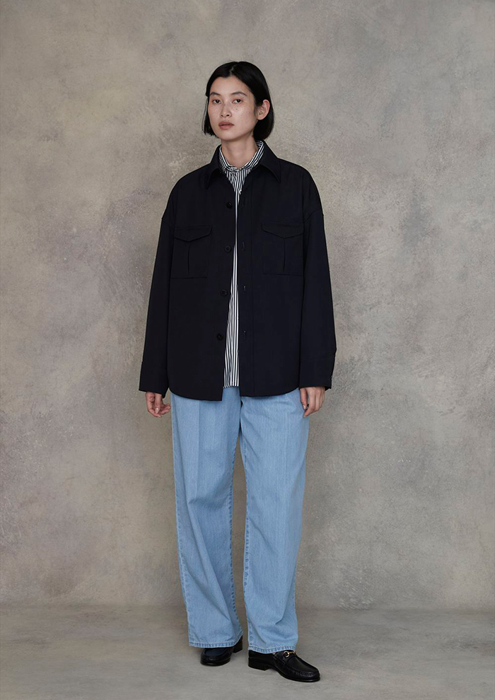「こだわりのウールギャバジンを使用し、絶妙なハリとしなやかさを併せ持つ生地で仕立てたミリタリーシャツジャケット。裏地付きで脇ポケットも備え、ライトアウターとしても活躍する汎用性の高い一着です。スクエアビッグシャツとのレイヤードは、シャツONシャツの新鮮なバランスを生み出し、モードな着こなしを実現。合わせたライトデニムは軽やかな質感とハイウエスト仕様で、腰まわりをすっきりと見せながら、美しい脚線を強調してくれます」。