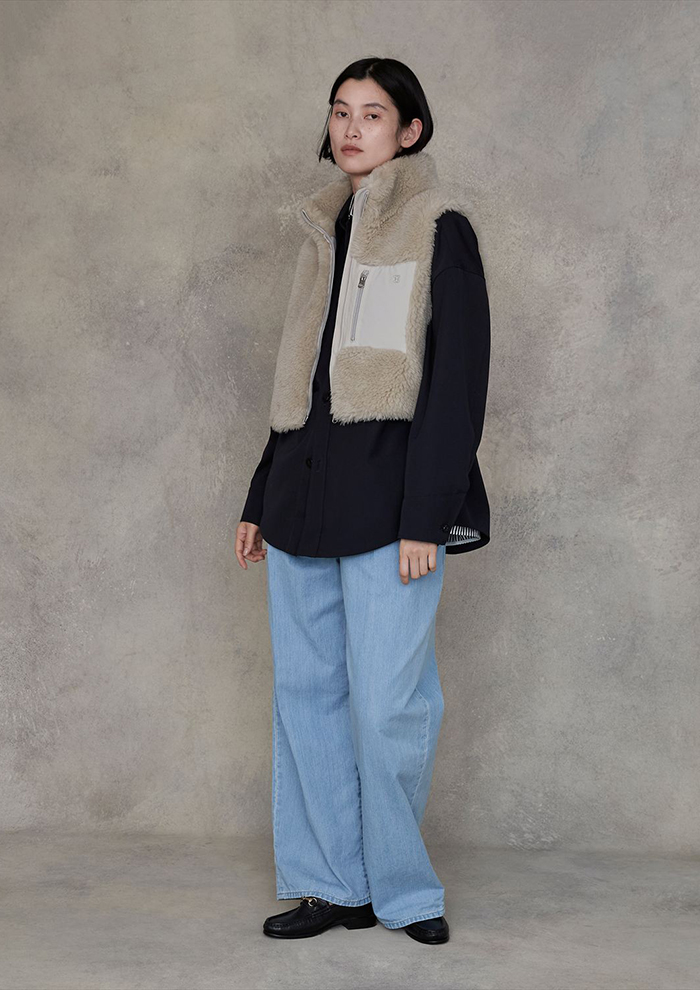 「前出のデニムスタイルに、クラフトファーのベストを合わせて。着丈を少し短くして今季らしいコーディネートのバランスに仕上げました。シャツやワンピース、ニットやジャケットなど、あらゆるアイテムに合わせやすく、素材の豊かな表情が上品なハイカジュアルスタイルを演出します」。