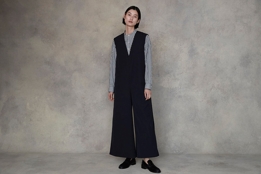 「ワイドシルエットの揺れる裾のラインが美しい、こだわりのウールギャバジンで仕立てたコンビネゾン。「ティッカ」のシャツやタートルネックとも相性が良く、ジレやジャケットを重ねればビジネスシーンにも対応する汎用性の高い一枚です。合わせたノーカラーシャツは、どんなボトムとも調和し、自分らしいスタイルを自在に取り入れられる万能アイテム。暖かな季節にはボタンを開けて軽やかに、寒い季節にはタートルをレイヤードしてモードな奥行きを楽しんで」。