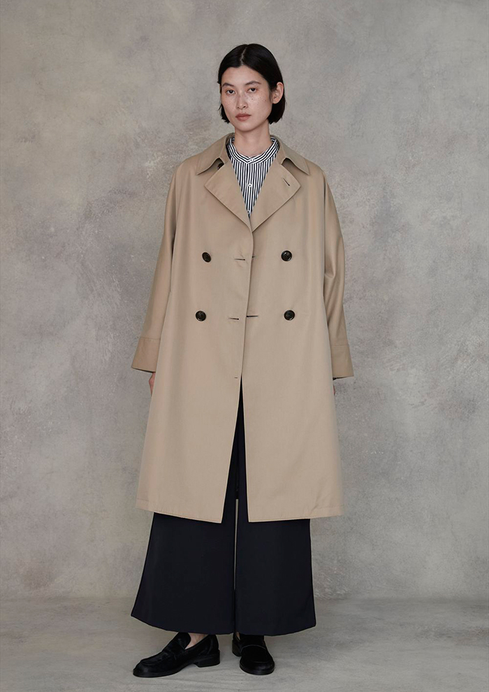 「前出のコンビネゾンスタイルに、テントトレンチコートを重ねてお仕事モードへ昇華。冬でもニットやマフラーを合わせれば厳寒期以外は活躍し、シーズンをこえて幅広く楽しめます。オーバーシルエットが生むこなれ感と、長すぎない着丈のバランスが絶妙で、パンツにもスカートにも自在にフィット」。
