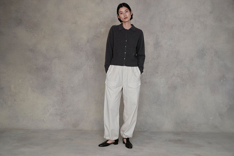 「コンパクトなサイズ感の軽くて暖かいヤクカーディガン。きちんと感と抜け感を兼ね備えたポロカーディガンのため、1 枚でこなれたスタイルを叶えます。襟付きデザインが上品さを与えつつ、柔らかな素材とゆとりのあるシルエットが抜け感を演出。カーゴパンツと合わせれば、モードな雰囲気の大人カジュアルが完成します」。
