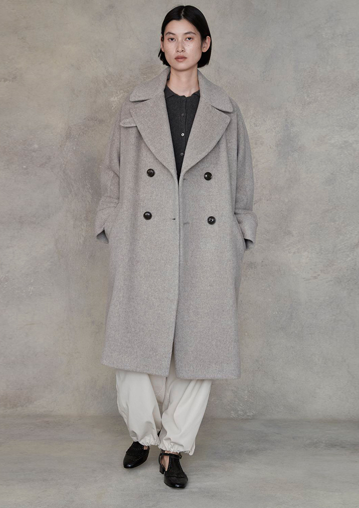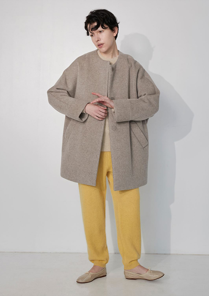 「新型ノーカラーコートは、テントコートのディテールを継承しつつバランスを再構築した一枚。上質なラムウールによる軽さと保温性、美しい毛並みが魅力で、7 色の展開です。柔らかなベージュでまとめたワントーンスタイルには、同色のニットを重ねて上品に。差し色のイエローのニットレギンスが軽やかな遊び心を添え、足元にバレエシューズを合わせるとフェミニンかつリラクシーに仕上がります。洗練された配色が日常を上品に彩って」。