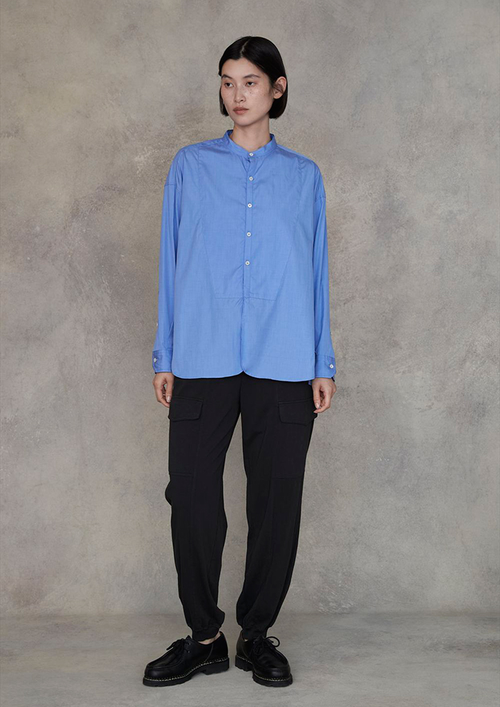 「ビンテージのディテールをモードに昇華したノーカラーシャツに、まさに“Addictive(夢中になるはきやすさ)”なパンツを合わせて。ゆったりとしたビッグシルエットは清潔感とリラックス感を両立。暖かい季節は羽織として、寒い季節はタートルとのレイヤードで、どの角度から見ても洗練されたモードスタイルに」。