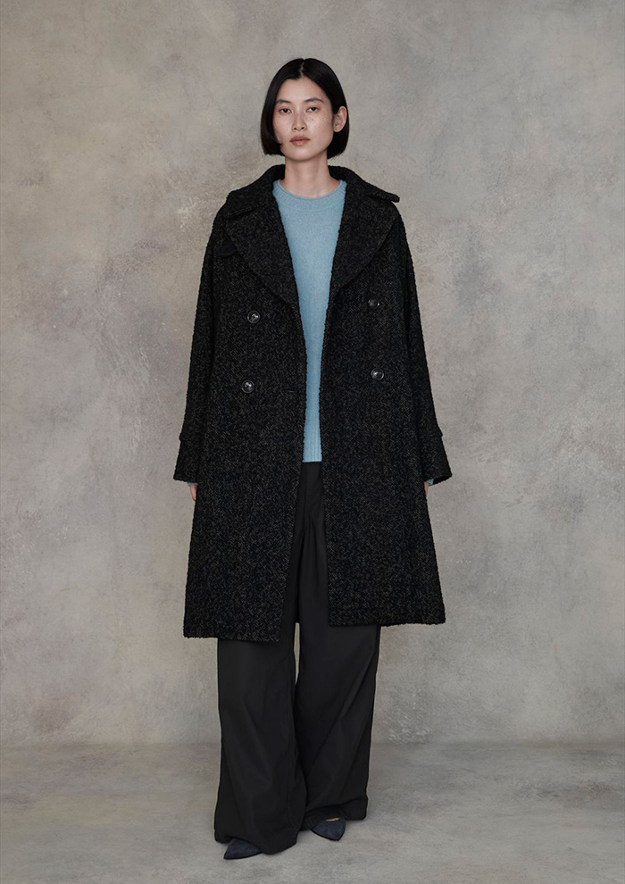 「前出のニットスタイルに、クラシカルな雰囲気のミックスツイードテントコートを重ねて。モノトーンの大人っぽい配色は幅広いアイテムと好相性。テントのように広がるオーバーシルエットがこなれた印象で、いつものコーディネートにバサッと羽織るだけで洗練をまとえます」。