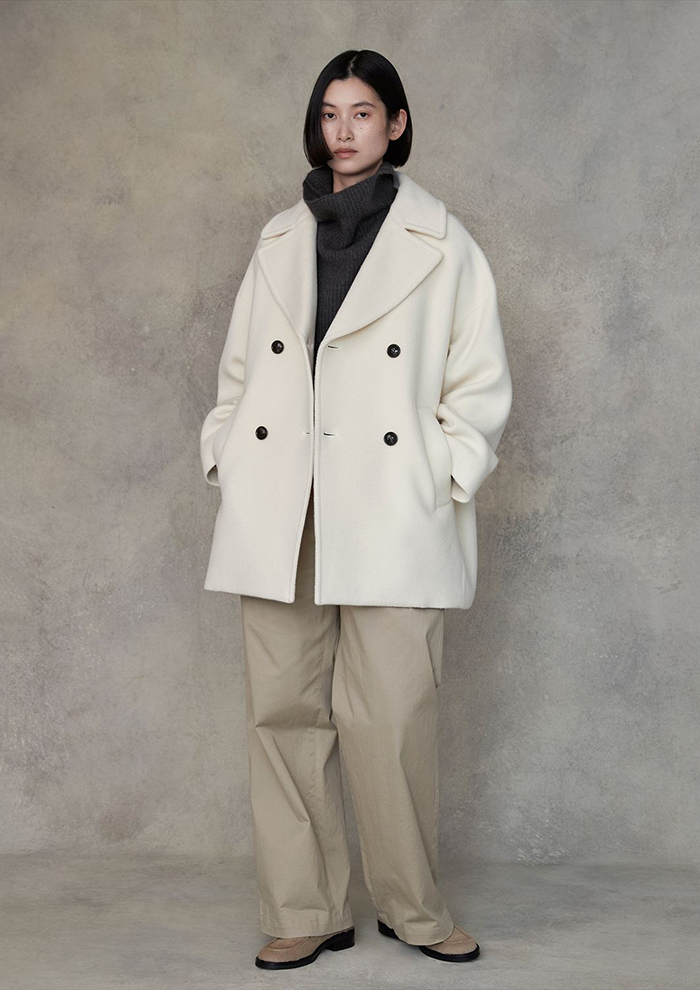 「「ティッカ」の秋冬の象徴でもある定番ピーコート。上質ラムウールを職人技でさらに軽く暖かく仕上げた一枚は、上品な毛並みと高い保温性を誇ります。特にオフホワイトは、秋冬の重くなりがちな装いを明るく軽やかに見せ、大人の清潔感と洗練された雰囲気を演出。ホワイト×グレーのモノトーンにベージュのボトムを合わせれば、柔らかさと軽快さが加わります。レザーシューズで知的に、スニーカーで抜け感をと、さまざまな足元にも対応」。