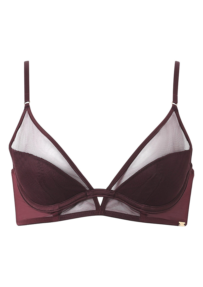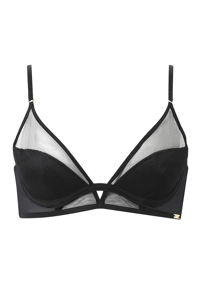 「前中心の圧迫感を軽減するL字ワイヤーと、ウレタン素材のカップを採用した、“ラクできれいにととのえられる”3/4カップブラジャー。マットで上品なサテンパイピングが輪郭を際立たせ、ベース生地の隙間から素肌がのぞくようにこだわったVラインがデザインポイントです」。