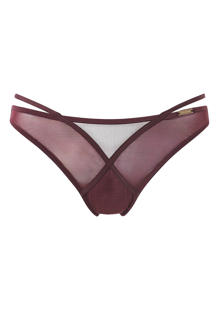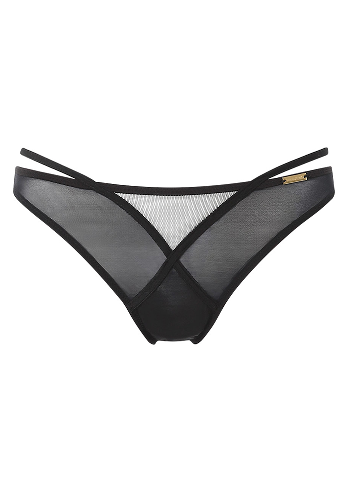 「こちらは、どんなボトムにも合わせやすいソングタイプのTバックショーツ。シンプルで軽やかな素材はアウターにひびきにくく、質感を生かしたシアーなグラデーションが洗練された美しさを演出します。フロントに施したX形状の大胆な切り替えラインと、ボディラインを引き立てるウエストのループ使いがアクセント」。