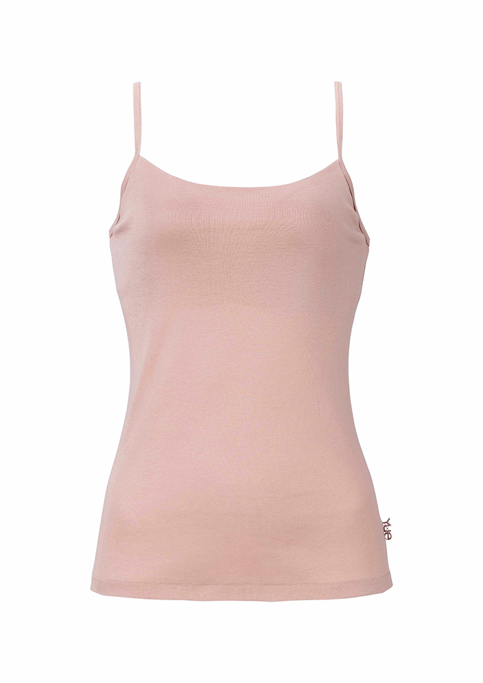 「前中心の圧迫感を軽減するL字ワイヤーと、ウレタン素材のカップを採用し、“ラクできれいにととのえる”設計のカップ付きロングキャミソール。前後の身頃にあしらったX形状の大胆な切り替えラインがポイントです。通常のランジェリーよりもタイトなシルエットのため、アウターへのひびきが気になるファッションもすっきりと着こなせます」。
