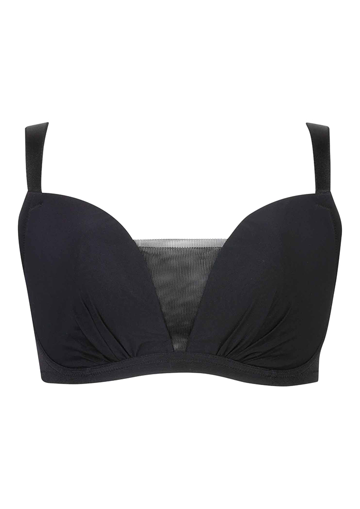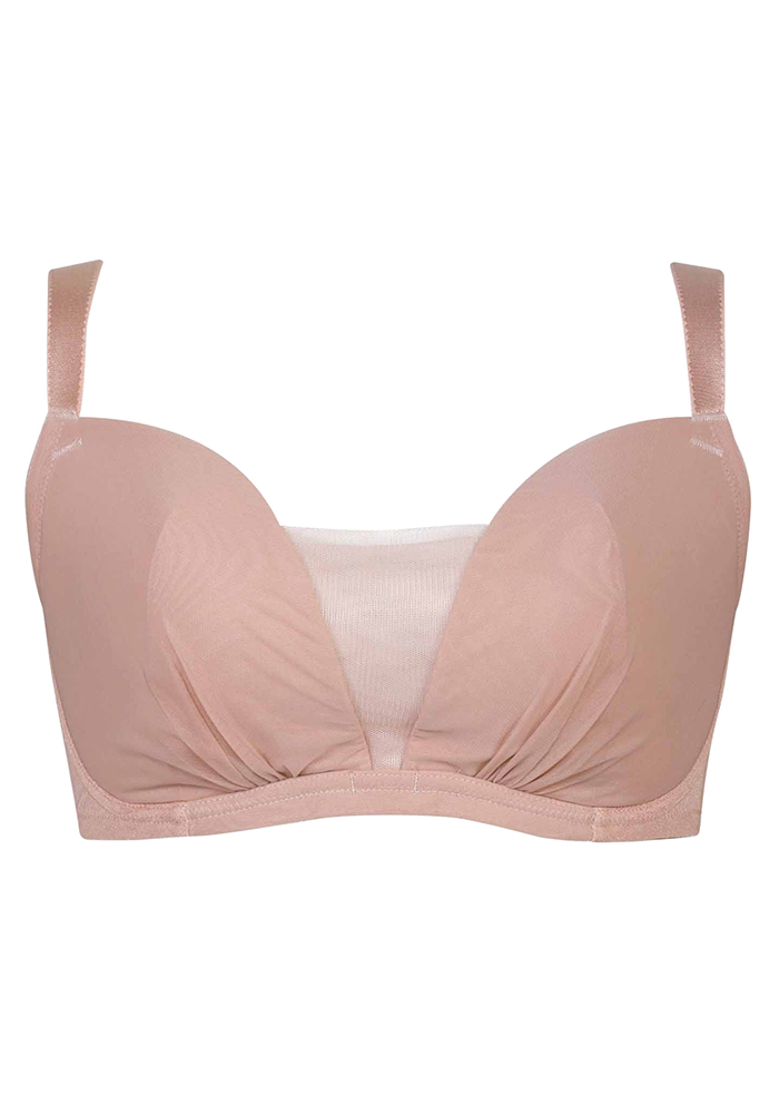 「こちらは、豊かなバストの方がシャツの前ボタンの隙間を気にせず着こなせるよう計算した、ミニマイズタイプのブラジャー。バストの突出をおさえミニマイズすることによって、よりアウターの着こなしが楽しめるアイテムです」。