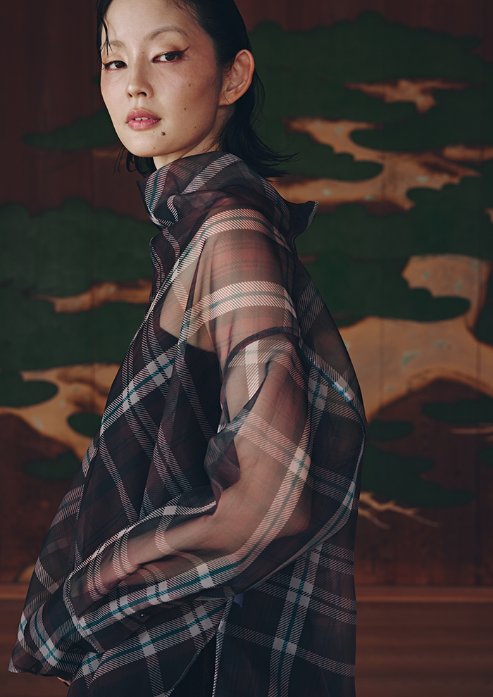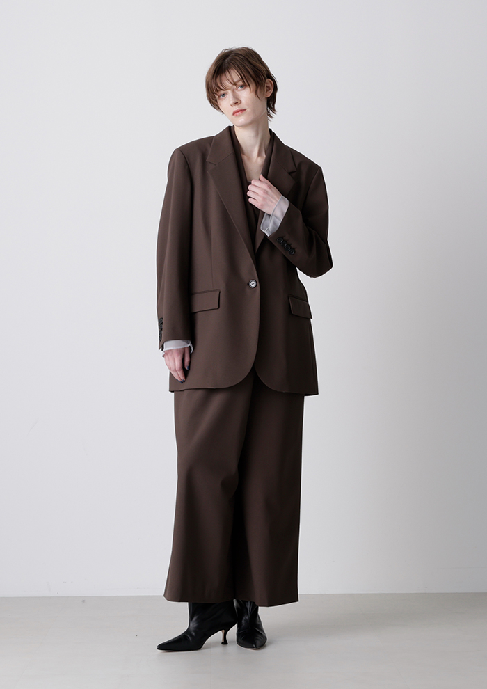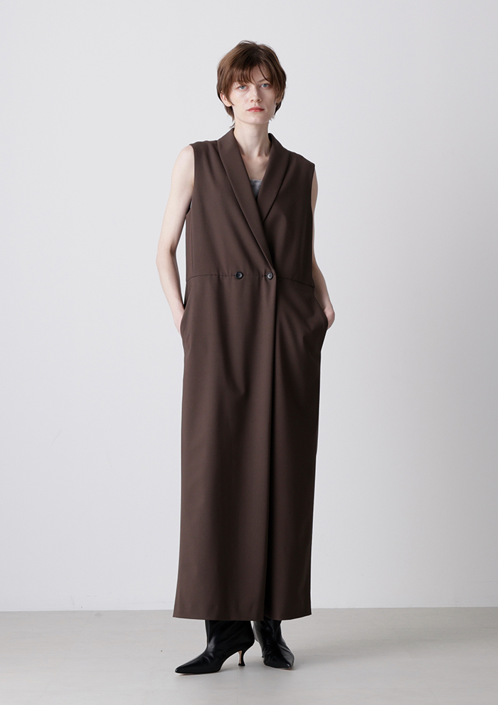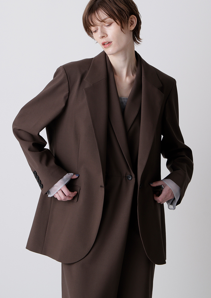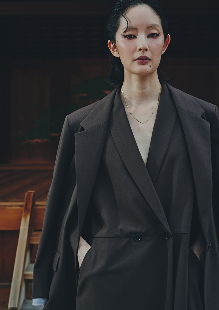 「ブレザーは、袖口からオーガンジーを覗かせたレイヤードディテールで、ほんのりセンシュアルなニュアンスを。ワンピースはタキシードジレのようなモードなオールインワンです。セミダブルの打ち合わせから続くラップデザインが、スタイルをシャープに引き立て、1枚で洗練された着こなしを演出。素材には、ドライタッチで快適な2WAYストレッチの梳毛生地を使用。毛羽立ちにくく、さらりとした肌触りはシーズンレスに活躍します。ブレザーと合わせれば、ハンサムなセットアップスタイルに。それぞれ単品でも着まわしができ、アクセサリーで華やかにオケージョン仕様に、フラットシューズでデイリーにと、幅広いシーンで楽しめます」。
