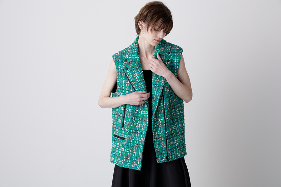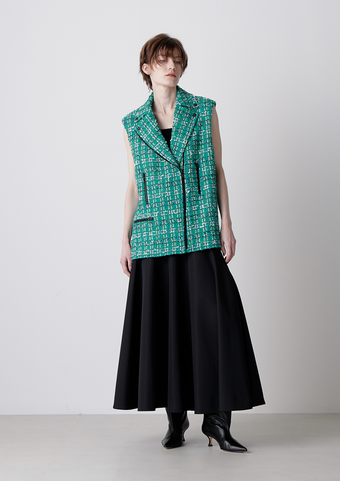 「まずは、クラシックなツイードを、オーバーサイズのライダースデザインに落とし込んだジレジャケットから。エレガントな装いにモードなアクセントを加える一方、デニムとのコーディネートでこなれ感のあるスタイルも楽しめます。素材は、ココ・シャネルをはじめ世界のデザイナーから愛されてきた「リントン」社製のファンシーツイードを使用。スカートは、腰位置にシームを施すことで、腰まわりをすっきりと見せながら、裾へと広がるドラマチックなフレアシルエットに。ほどよいハリと横ウネの表情をもつポリエステルグログランは、エレガントなムードをまといながら、シワになりにくい実用性も兼ね備えています」。