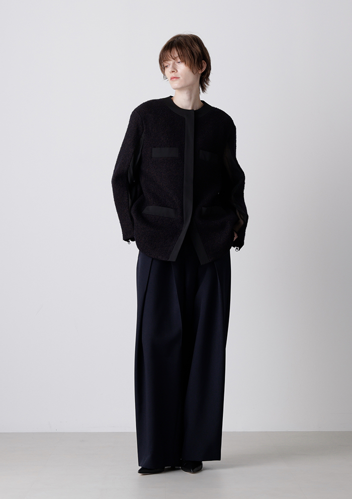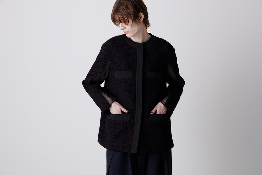 「立体的な国産ブークレ素材を用いた、オーバーシルエットのツイードジャケット。クラシックなムードに、ブラックのグログランをアクセントに加え、エレガントかつ洗練された佇まいに仕上げています。トレンド感とタイムレスさを併せ持つ一着」。