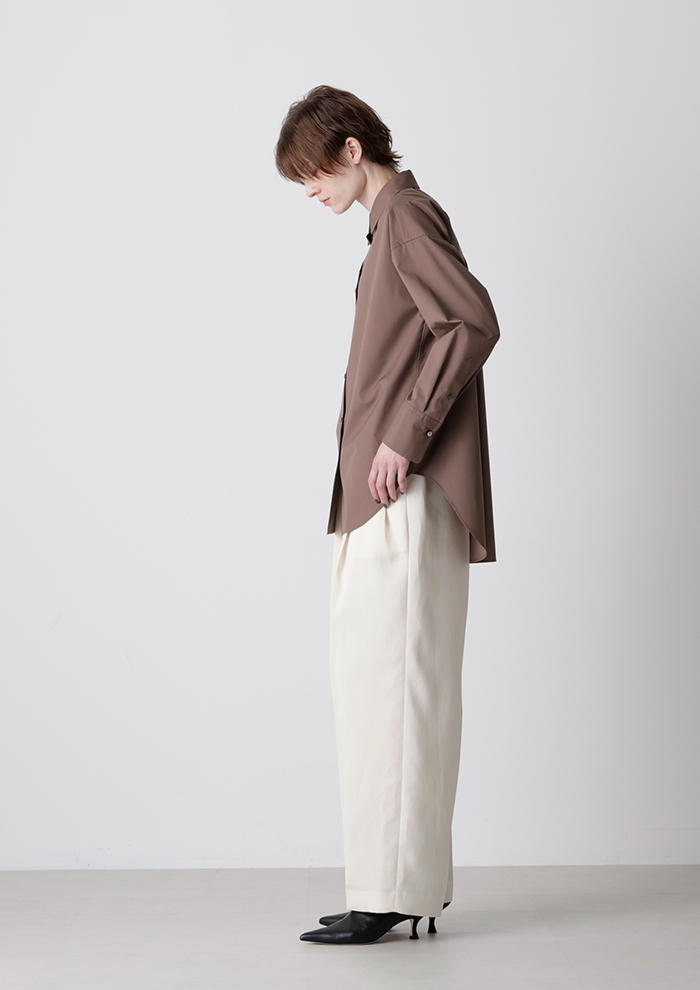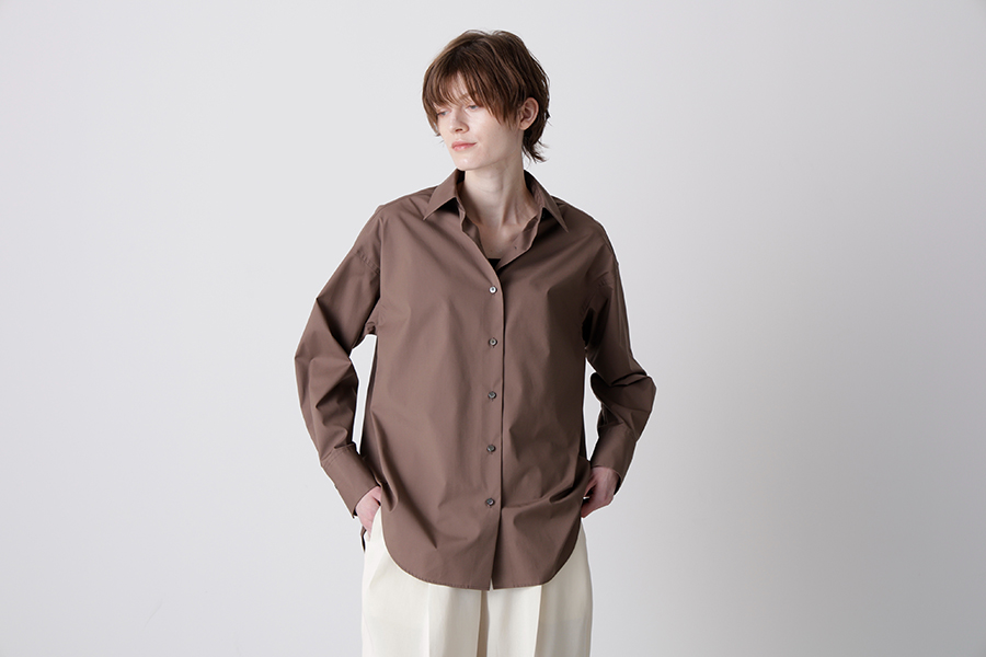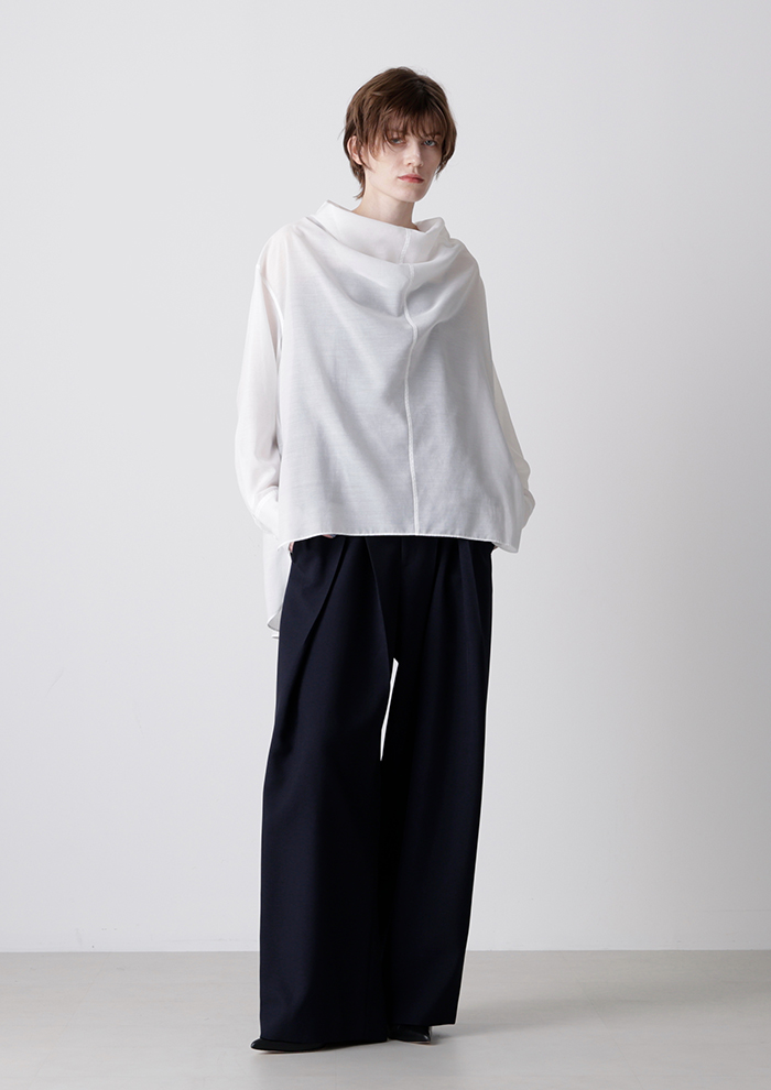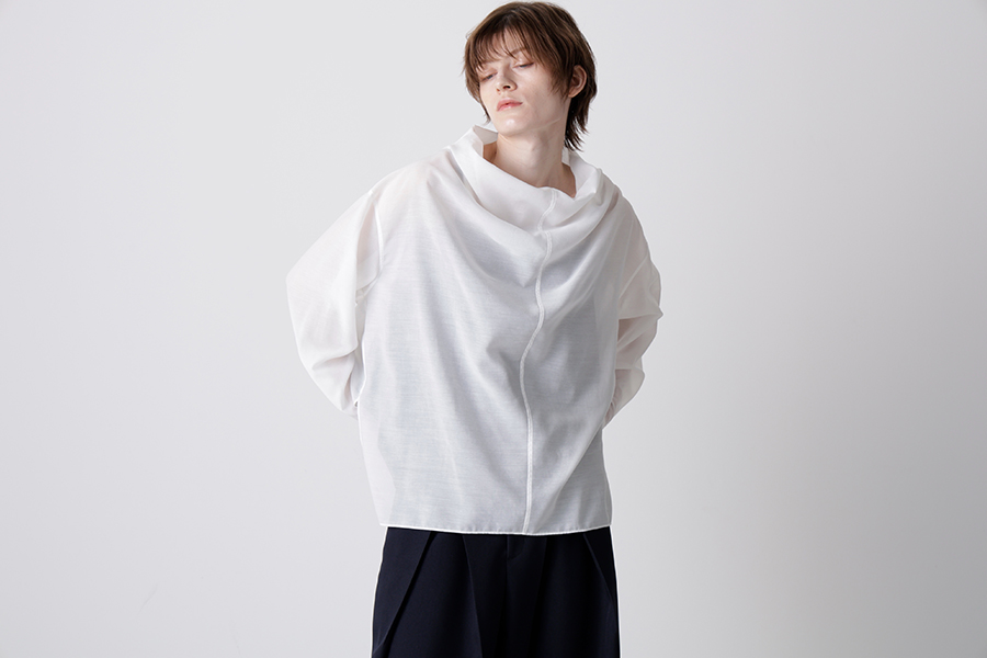 「ドレープを効かせたオフスタンドカラーが、ミニマルでいてエレガントな表情をプラス。薄くて軽やかな素材は、美しい落ち感とシワになりにくいイージーケア性を兼ね備えています。ジャケットのインナーとしても、洗練された着こなしを実現」。