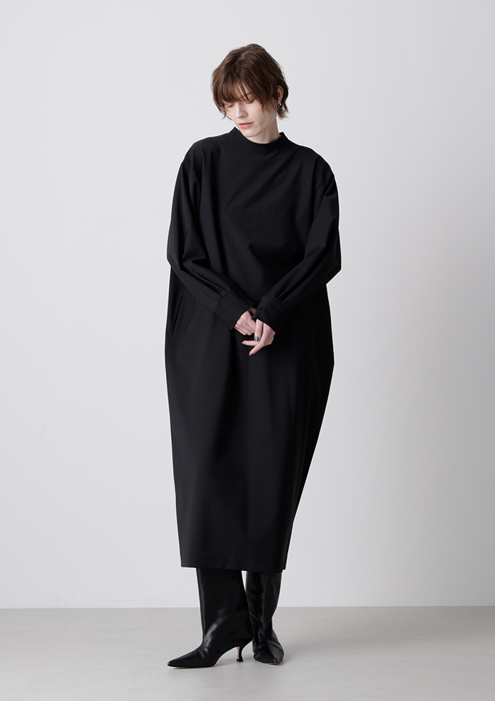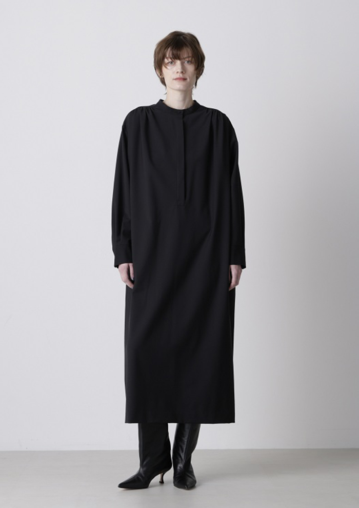 「前開きのバンドカラーをバックオープンのスタンドカラーとしても楽しめる、前後2WAY仕様のミニマルドレス。上品なツヤをたたえる表面感と、しなやかな落ち感が魅力のストレッチ素材を使用しています。ブラックとグレーの2色展開で、シーンを問わず着こなせます」。