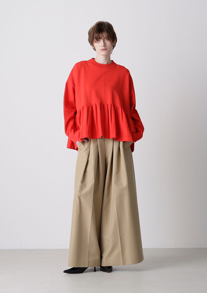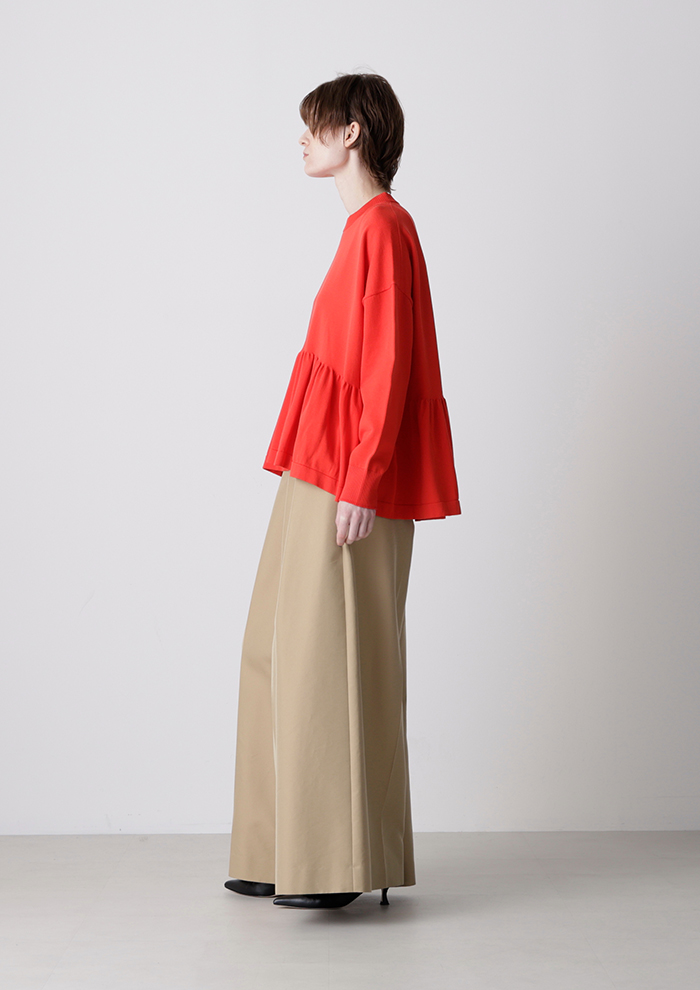 「表は軽やかでほどよい光沢のあるポリエステル、裏は素肌に心地よいコットンを使用した二重構造ニット。ウエストから自然に広がるよう計算された編み続きのペプラムは、特殊な編み地によって立体感のあるギャザーを表現しています。甘さを抑えたリラクシーなシルエットが、上品さとトレンド感を兼ね備えて」。