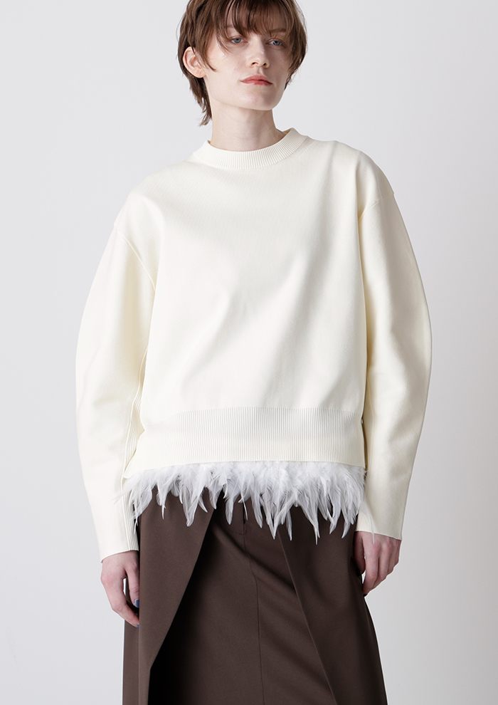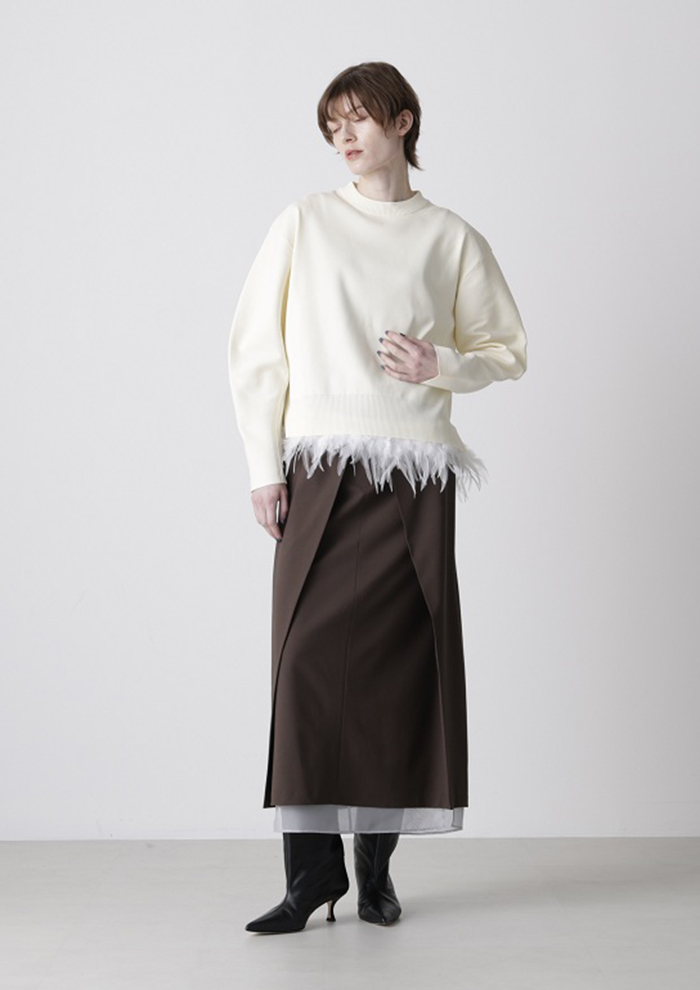 「ニットプルオーバーとオーガンジーインナーをセットにした着まわし力の高いレイヤードアイテム。ニットはポリエステルスムースのほどよい肉感でシンプルに着こなしやすく、インナーはヘムのフェザーがポイントとなり、ジャケットのインナーにもおすすめ。セットでも単品でも楽しめる万能な一枚です」。