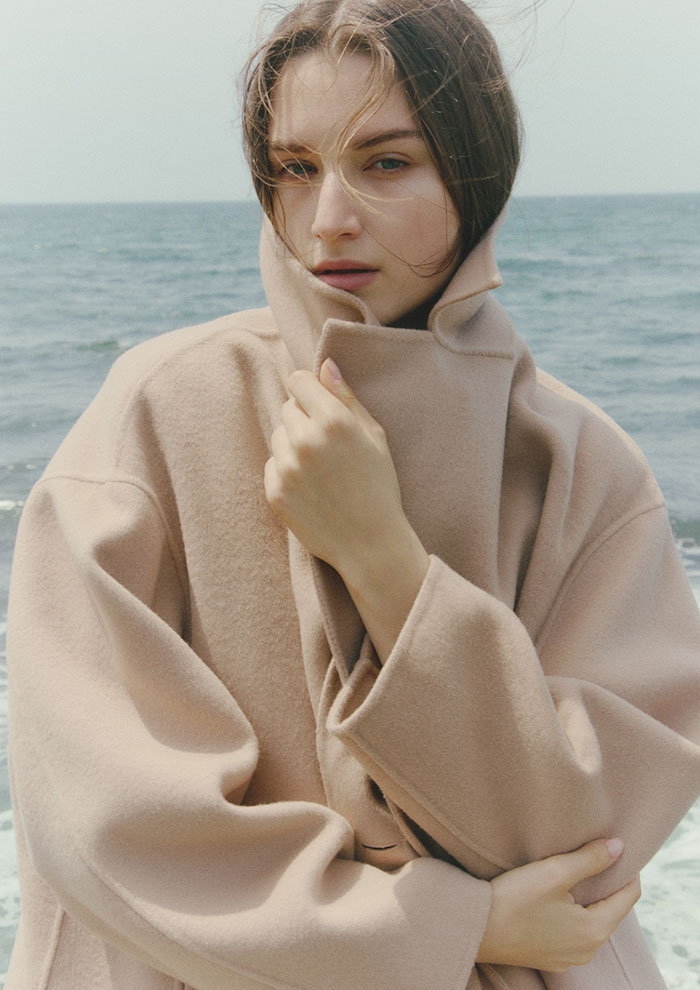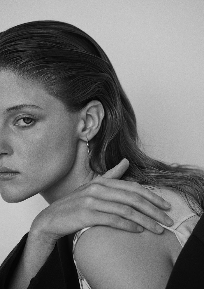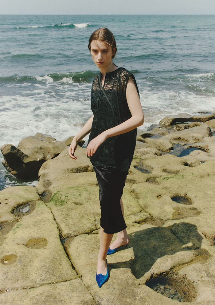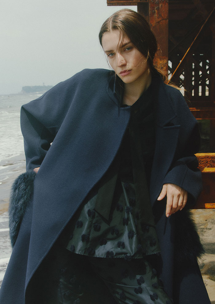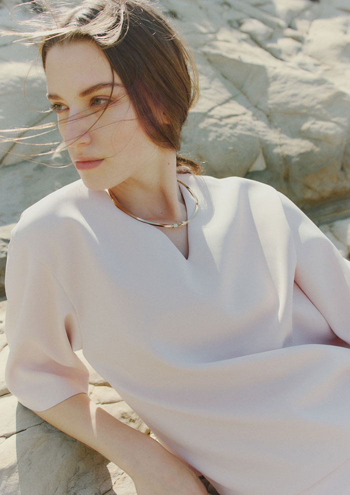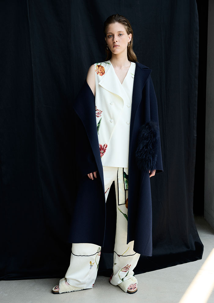 「最初にご紹介するのは、20周年を記念して特別に企画したエクスクルーシブアイテム。アーカイブコレクションをアップデートし、今のムードに落とし込みました。時代をこえても色褪せない上質で繊細な生地の質感は、まとうだけでエレガンスなムードを引き立てます」。