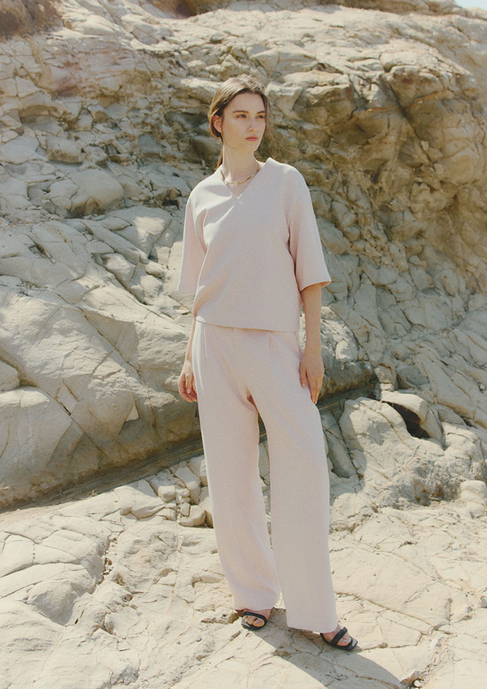 「続いてご紹介するのは、しなやかな落ち感が魅力のドビーストレッチジョーゼットのブラウスとパンツのセットアップ。伸縮性があり、さらりとした質感なのでデイリーユースにぴったりです。セットアップでコーディネートすると、より洗練されたスタイルに。仕上げにゴールドのアクセサリーをプラスして、さらにクラス感を高めて」。
