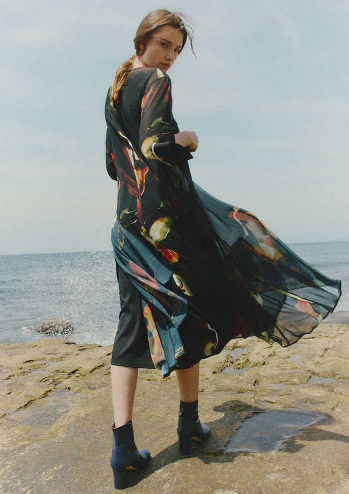 「こちらは、さらりとした軽やかさが魅力のメルティングプリントワンピース。ドライタッチの質感と軽さが特徴のシフォンにモチーフをプリントした素材です。風をはらむとシフォンがたなびき、また違った表情に。動くたびにドラマチックにゆれるワンピースは、着こなしの鮮度を上げてくれます」。