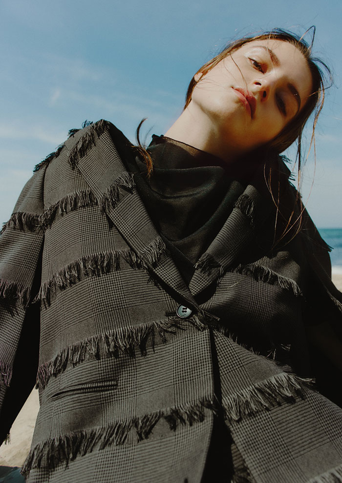 「グレンチェック柄とフリンジが秋気分を盛り上げるこちらのセットアップは、ロングブーツを合わせるとモード感がアップしておすすめ。ジャケットはテーラーカラーでケープのように見えるフレアスリーブのため、中にシャツをレイヤードしたスタイルも楽しめます」。